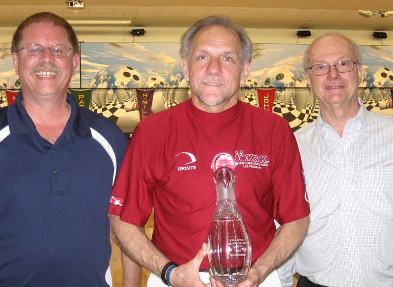 | Ron Mohr (center), with Miller High Life rep, on left, and George Pappas on right (Photo courtesy PBA LLC) |